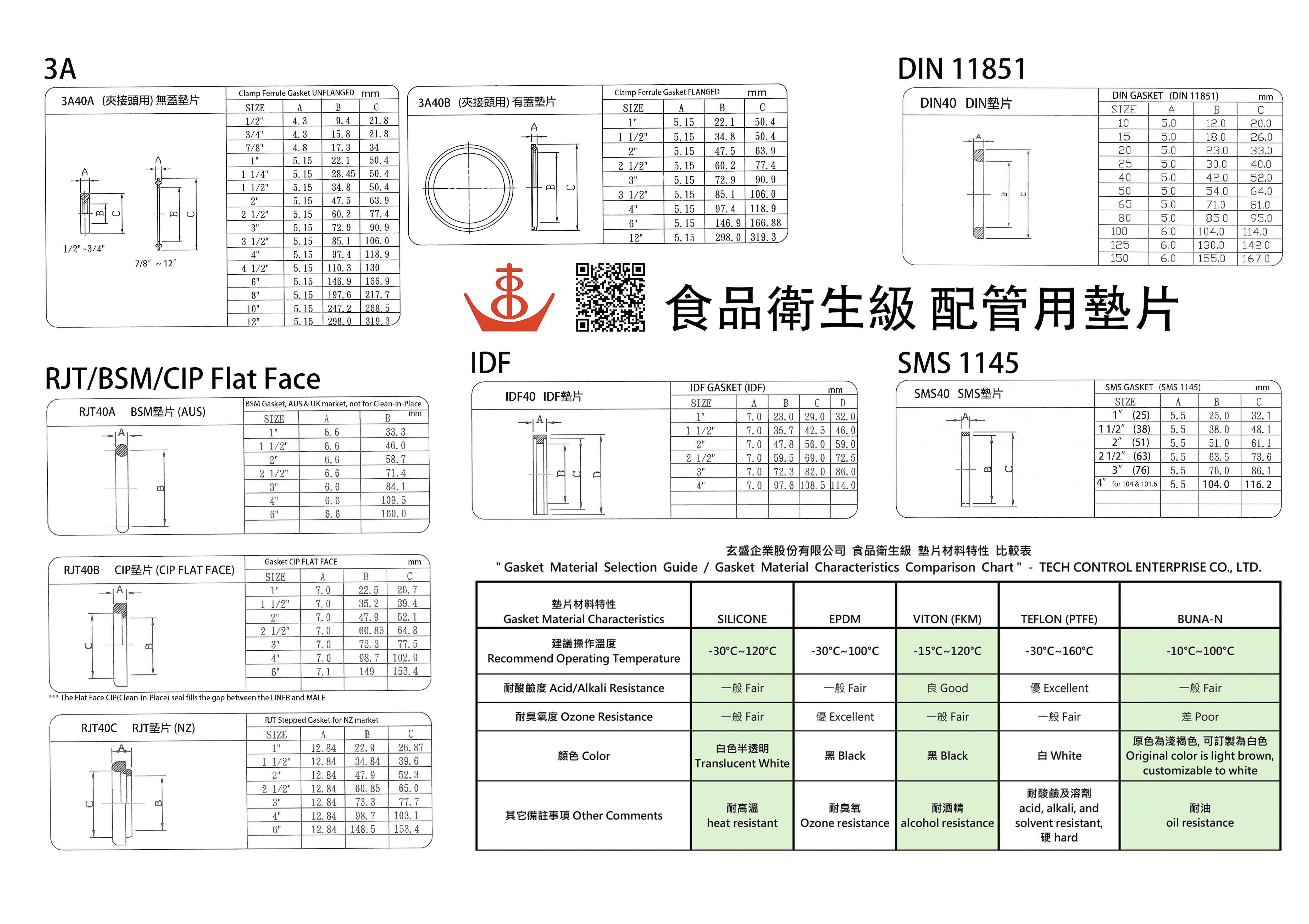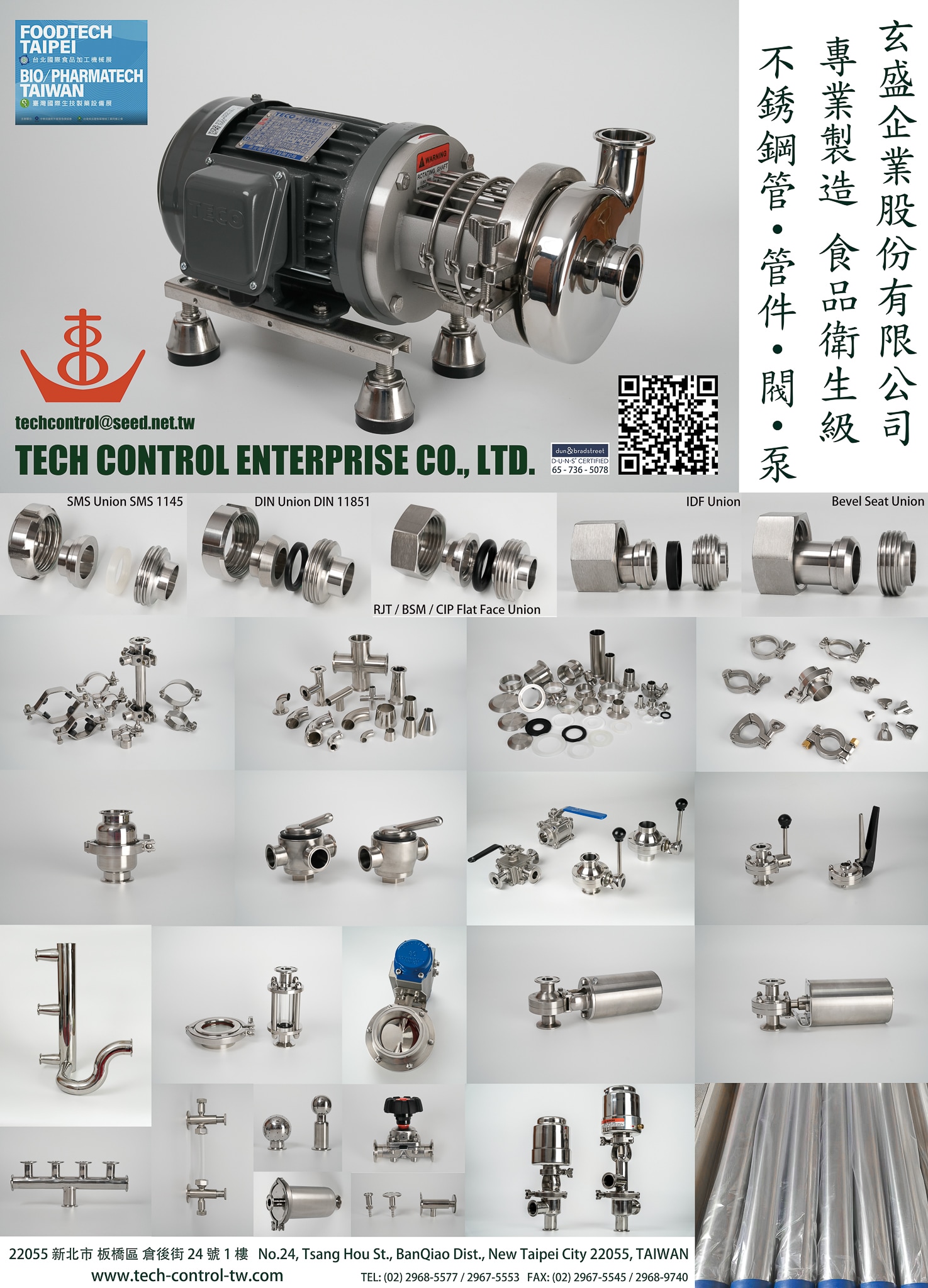 卡箍, 夾接, 對焊, 管接頭, 管夾, 由任, 盲蓋, 長彎頭, 短彎頭, 90 度彎頭, 45 度彎頭, 長三通, 短三通, 長異徑焊式三通, 短異徑焊式三通, 夾式三通, 異徑夾式三通, 焊式同心大小頭, 偏心焊式大小頭, 夾式同心大小頭, 焊式十字通, 夾式十字通, 玻璃視窗, 洗淨噴球, CIP清洗球, 旋轉噴球, 桶槽液位計, 過濾器, 管架, 符合FDA要求之食品級衛生級配管用各式墊片, Silicone, EPDM, Viton, Teflon, Buna-N …